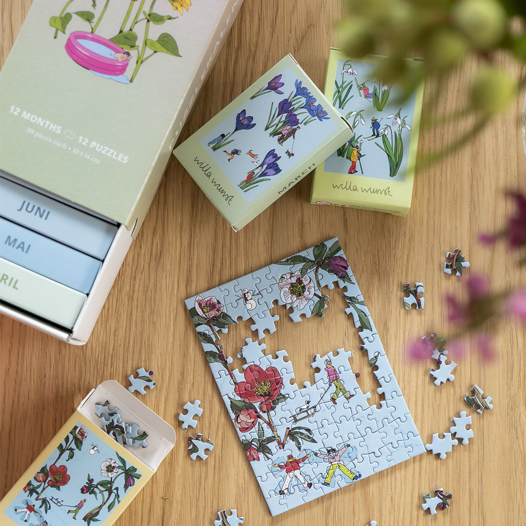 Zwischen Blumen, Blüten und kleinen Figuren entfaltet sich eine verspielte Reise durch das Jahr. 12 Mini-Puzzles mit 99 Teilen laden dich zu kreativen Pausen ein. Jeden Monat ein neues Wunstwerk für zuhause oder unterwegs.