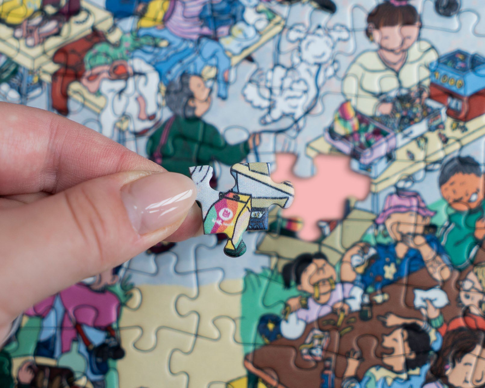 Marie-Lulu Högemann hat neben dem Flohmarkt Puzzle auch schon unser Smash it! Puzzle illustriert. Ihr bunter, lebendiger Stil steckt voller erzählerischer Elemente und einem Augenzwinkern. Besonders liebt sie es, kleine Details einfließen zu lassen, die sich nach und nach beim Puzzeln entdecken lassen. Beim Flohmarkt-Motiv hatte sie besonders Freude am „2000er-Nostalgie-Tisch“. Dort konnte sie Dinge unterbringen, die sie selbst früher gern in ihrem Kinderzimmer gehabt hätte. Inspiration sammelte sie außerdem durch die Fernsehsendung Bares für Rares, die sie zufällig kurz vor der Arbeit am Motiv für sich entdeckte. Das Zeichnen des Flohmarkt-Puzzles hat Marie-Lulu so viel Spaß gemacht, dass die Ideen nur so sprudelten. Zum Glück gab es eine Deadline – sonst würden wir wohl immer noch neue Details von ihr bekommen. So aber können jetzt alle entdecken, was sie liebevoll im Motiv versteckt hat.
